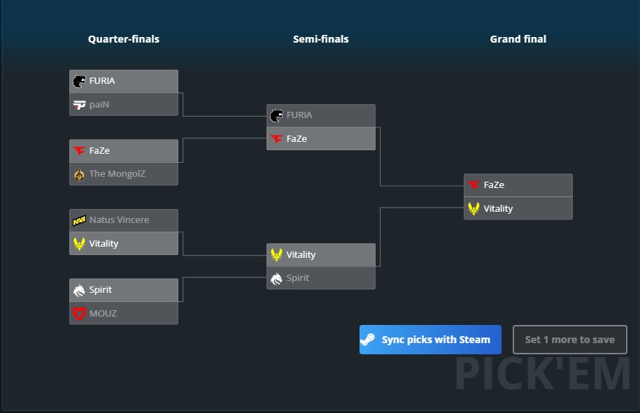 Gute Idee auf jeden Fall, VP gegen PaiN als letztes auszuspielen. Da bleibt die Spannung bis zum Schluss, nur NaVi - Vitality steht schon fest als QF