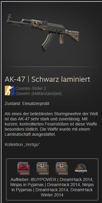ZusĂ€tzlich sind bei einigen skins das pattern (âfloatâ) noch wichtig, da es spezielle farbmuster gibt, die noch mal mehr wert sind. Zb bei der ak case hardened, dass auf der Oberseite alles blau ist. Das ist die 1 Million Dollar AK die NiKo spielt, die wurde fĂŒr 1 mio damals verkauft weil one of a kind und niko hat die dann fĂŒr paar Events von dem Sammler / trader ausgeliehen. Ist leider absolut krank was fĂŒr Preise und was fĂŒr ne bubble sich um die skins aufgebaut hat