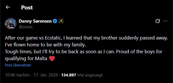 VS ECSTATIC gewonnen hat, bekam Zonic die Nachricht, dass sein Bruder verstorben ist und er daher abgereist ist.