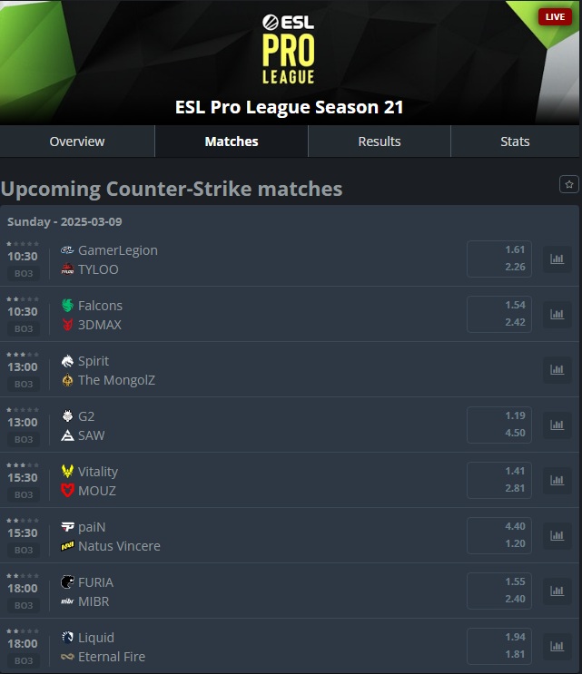 Jo. Vitality schon ein eigenes Level. Da müsste schon viel zusammen kommen, dass mouz da Land sieht. Gehe von einem 2:0 aus, 2 mal einstellig. Das Gute ist, dass Vitality das einzige Team ist, das ich klar besser als mouz sehe. Von daher danach nochmal 2 gute Chancen, sich für die Playoffs zu qualifizieren.