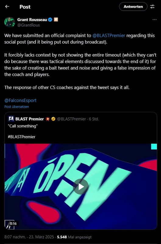 After BLAST played a [brief snippet]of a Falcons tactical timeout during the team’s game against Virtus.pro, Falcons Global Director of Esports Grant Rousseau shared that the team has filed a complaint with BLAST regarding their decision to publish the clip.