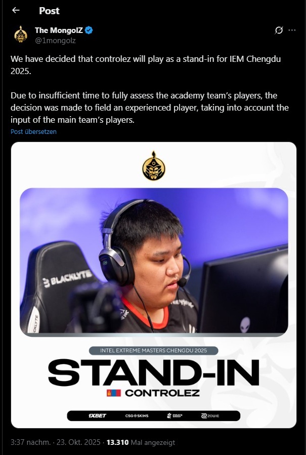 mit controlez will play as a stand-in for IEM Chengdu 2025