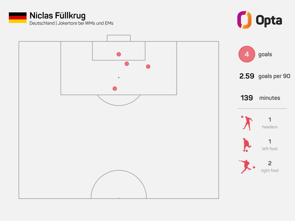 Füllkrug ist damit der erste europäische Stürmer, der bei Welt- und Europameisterschaften auf vier Tore als Einwechselspieler kommt. Als nächstes kann er nun den EM-Rekord anvisieren, den einer seiner Vorgänger im DFB-Trikot aufstellte: Dieter Müller ist der Einzige in der EM-Geschichte, der drei Jokertore erzielte.
