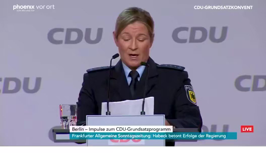 falls das problematisch ist, in polizeiuniform politisch aktiv zu werden (was ich ehrlich gesagt vermute und persönlich auch hoffen würde), frag ich mich halt, warum offensichtlich weder sie noch irgendjemand von den verantwortlichen dort da irgendwie drüber nachgedacht hat.