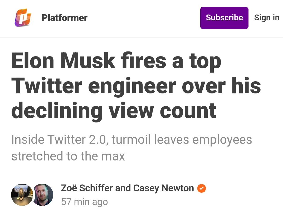 Elon hat wohl ein Notfallmeeting anberaumt um herauszufinden warum seine Posts weniger Views haben. Einer der letzten zwei Principal Engineers hat dann anhand von Google Trends die Theorie aufgestellt, dass er im Moment nicht so Thema wäre und deswegen nicht ganz so viele an seinen Tweets interessiert wären. Elon hat ihn dann gefeuert.