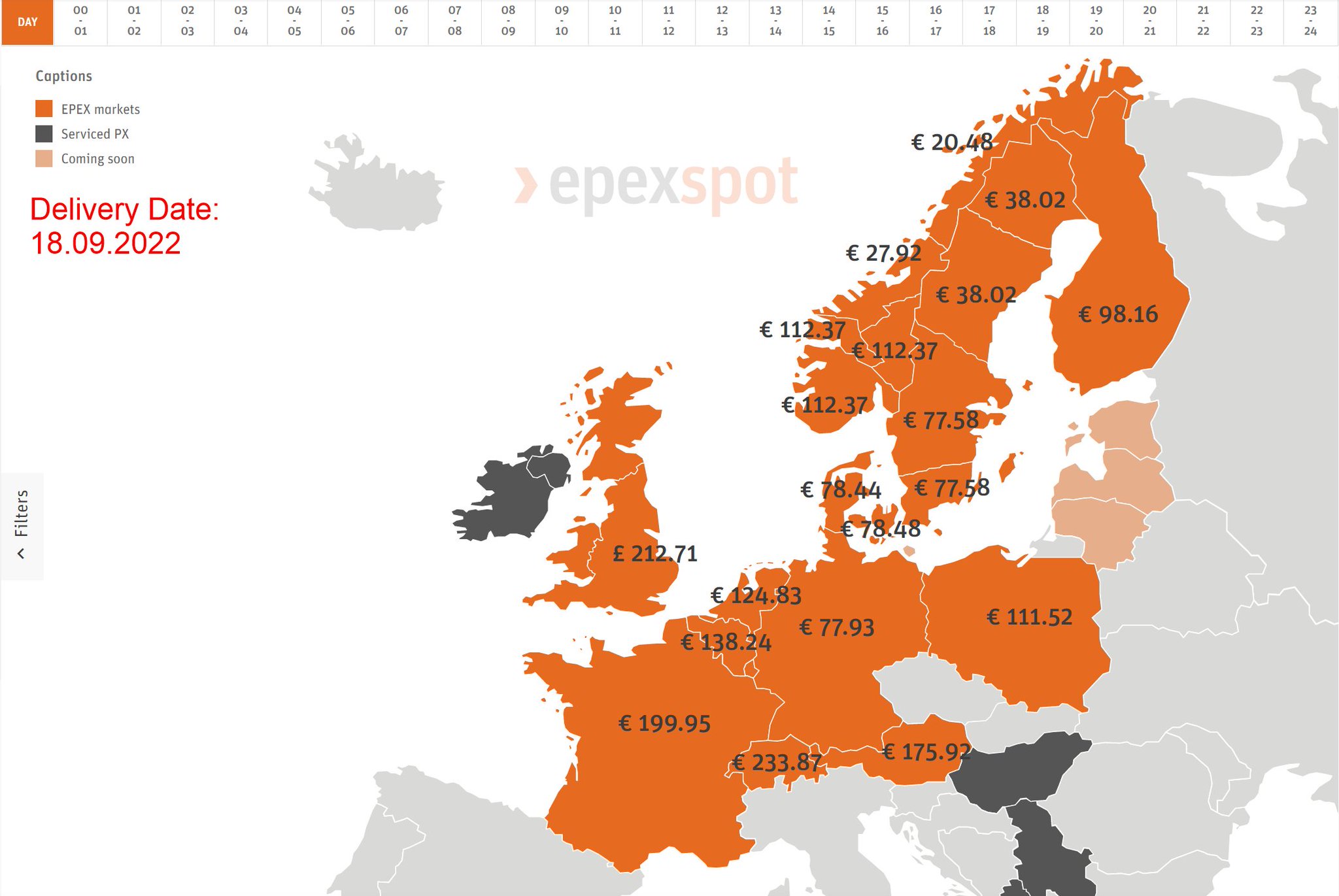 Aktuelle Strompreisbörse in Europa.