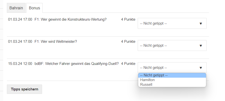 @KRUPS und @Dirk4MVP bitte nochmal die Bahrain-Tipps anpassen. Es sind nun jeweils die Top 10 zu tippen. Punkteregeln bleiben zum Vorjahr gleich - korrekter Tipp sind nun 10 statt 8 Punkte, je abweichender Position jeweils -1.
