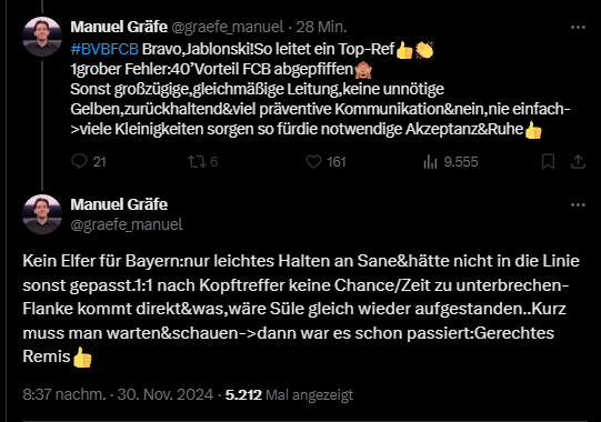 Kann mich nicht an irgendwas erinnern, was da 50/50 war. Er hat halt so ziemlich alles laufen gelassen, auf beiden Seiten. Nur Goretzka gegen Groß vllt., und das hat er für die Bayern gepfiffen.