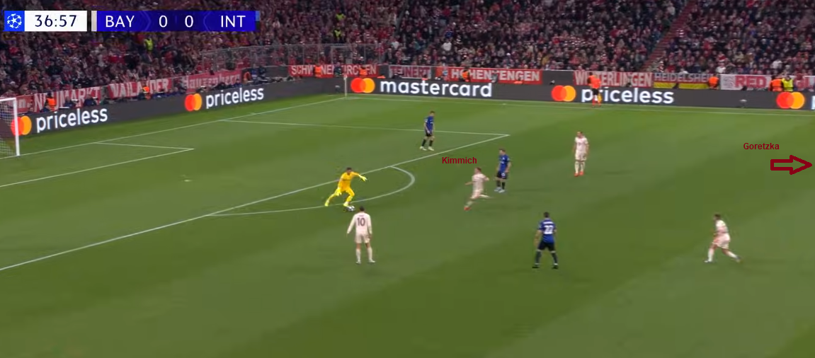 er muss ihn übernehmen, weil goretzka einfach gar nichts macht. dass er dann nach einem sprint quer über den kompletten platz nicht mehr einholt ist irgendwie zu erwarten.
