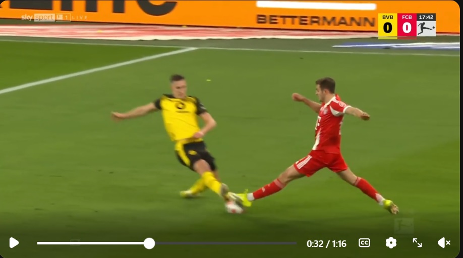 das sag ich doch genau. er stempelt neben den ball, während schlotterbeck den ball trifft.
