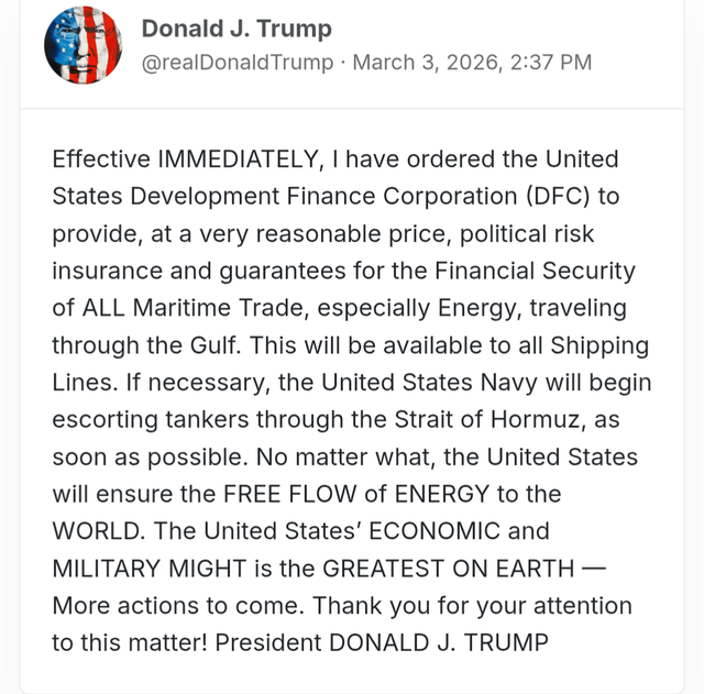 Trump scheint schon länger etwas Lust auf den Konflikt verloren. Die Golfpartner werden nicht geschützt. Es geht ihnen die Munition für die Abwehrsysteme aus und die USA ziehen THAAD Systeme aus Südkorea in den nahen Osten, während ein nicht kleiner Teil der iranischen Angriffe mit billigen Kamikazedrohen passiert. Die Weltwirtschaft geht den Bach runter. Nicht nur die geopolitischen Feinde wie China sind auf das Öl angewiesen, nein auch loyale Partner wie Japan, Indien und auch die EU.