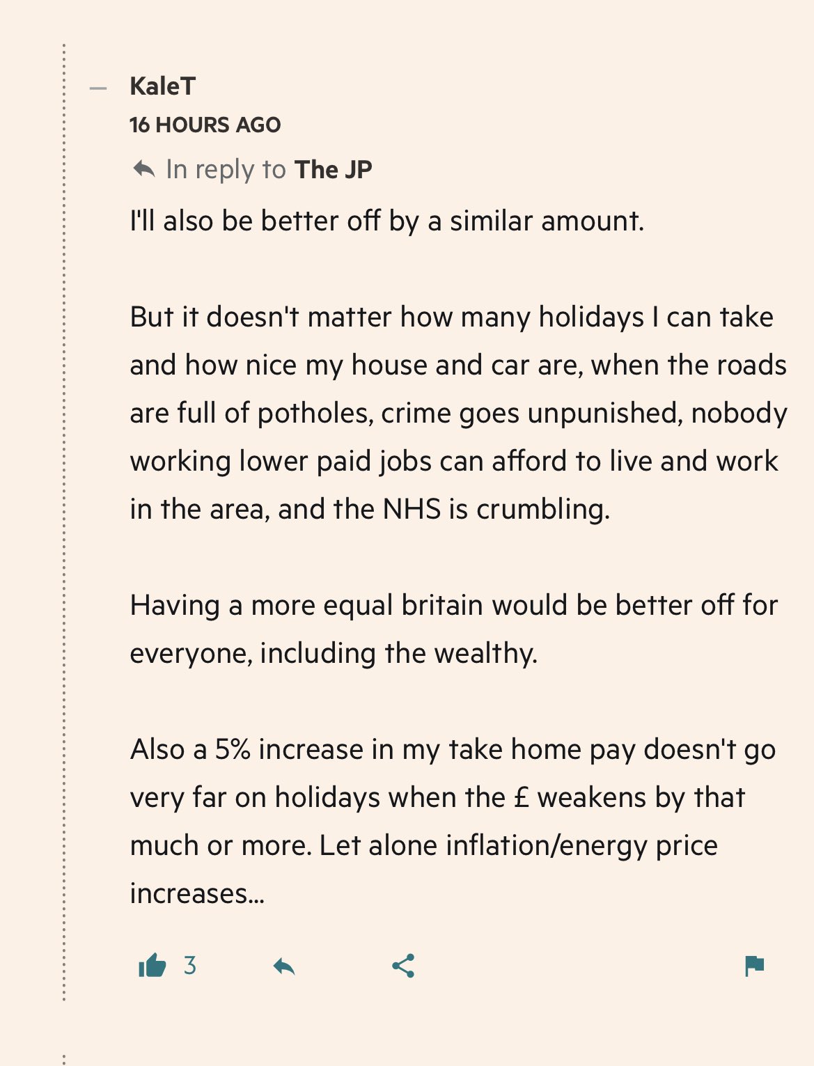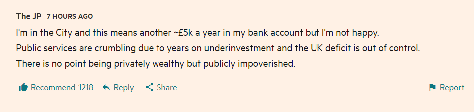 Konkret gestolpert bin ich über den Top-Kommentar unter einem Financial-Times-Artikel - nicht gerade für ihre „linke“ Leserschaft bekannt - von einem Mitarbeiter im Finanzsektor („in the City“ = „arbeite in der City of London im Finanzsektor“), der von einer Redakteurin auf Twitter hervorgehoben wurde und das Problem meiner Meinung nach ganz gut zusammenfasst: