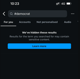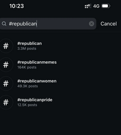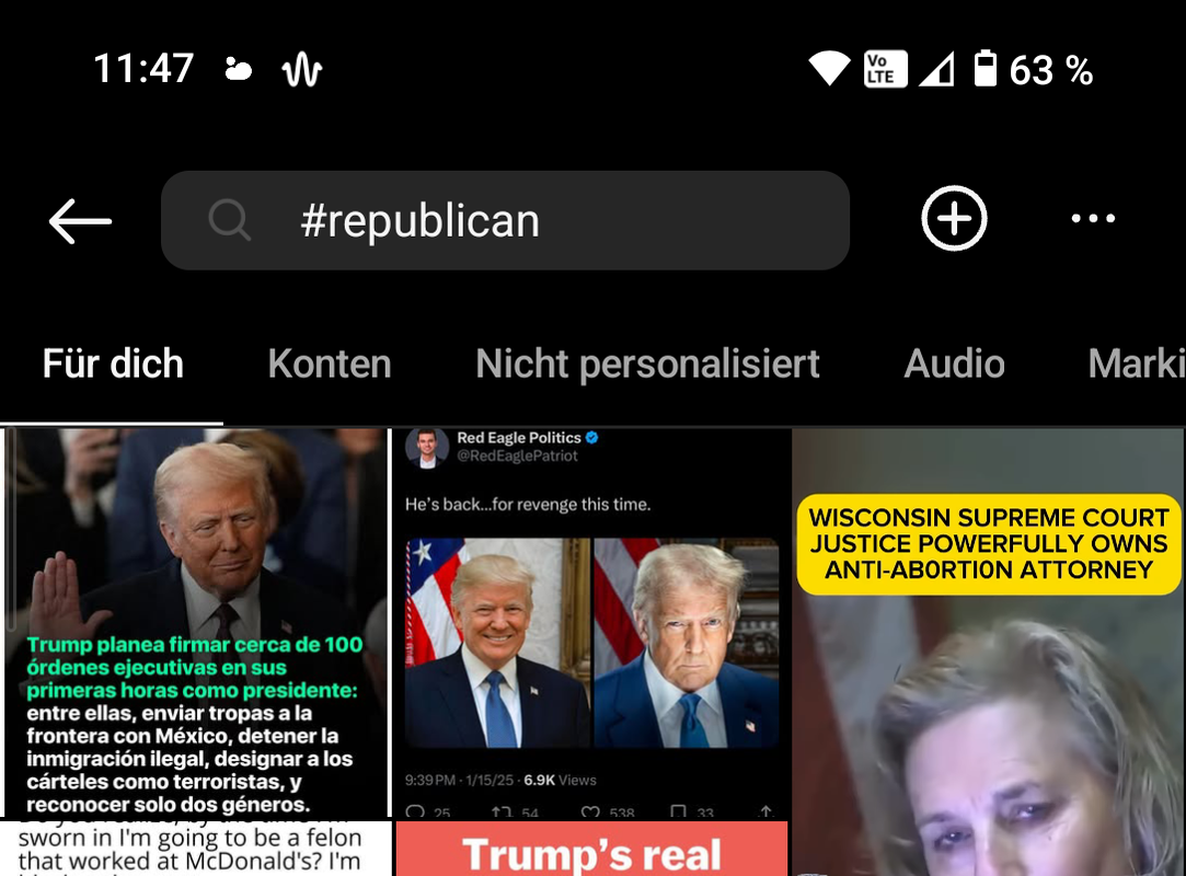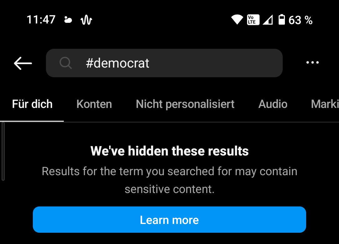 Bei #republicans zeigt Insta noch an, wie viele Posts es gibt (1 Mio). Bei #democrats kommt bei mir gar nix mehr. Wenn man aktiv auf Suche klickt, kommt wahllos Politikcontent, oft mit Trump