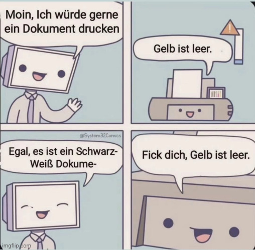 Sichi kennen wir das. Es gibt nur eine Verbotsverfügung in bunt zu drucken, also ist unsere Gelb-Kartusche noch prall gefüllt oder halt vertrocknet, müsste man mal nachsehen