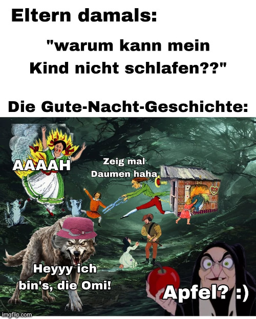 Never forget Kinder im Wald aussetzen, weil die neue Dirne kB auf sie hat.