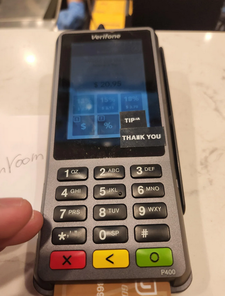 Am besten am Tresen einen schlecht gebrauten Kaffe rüberreichen und dann aufm EC-Automaten wie so Amis 15% 20% 22% 25%.