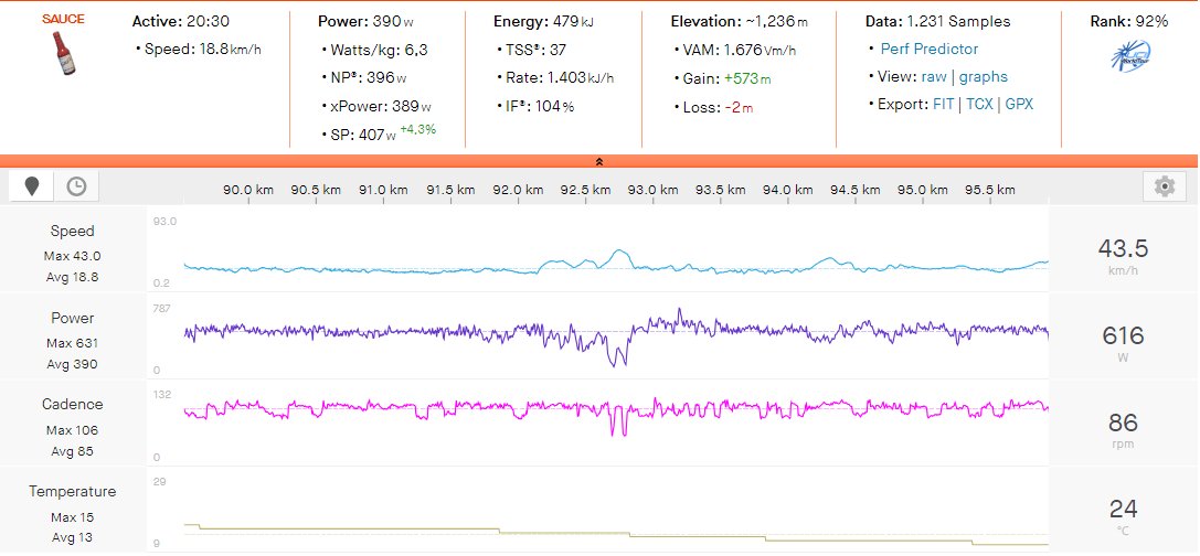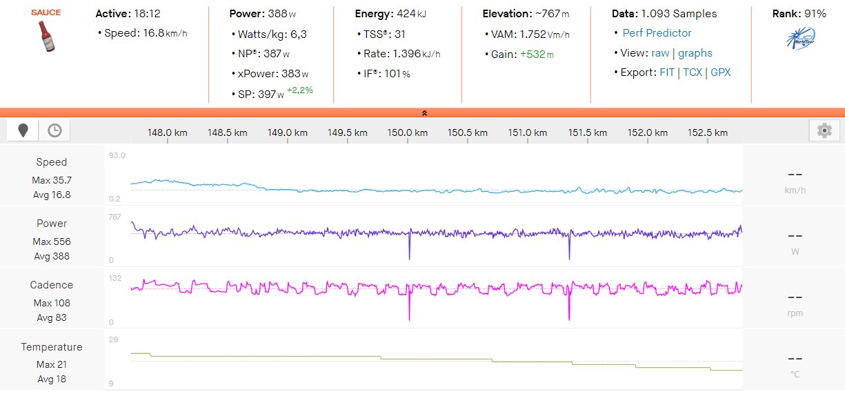 Then on the Marie Blanque: 6.3W/kg for 18’, after 3500kJ’s in 3h20. Very nice performance from Buchmann. And take a look at Buchmann’s cadence, looks like he consciously switching between 90 and 70 rpm, interesting stuff!