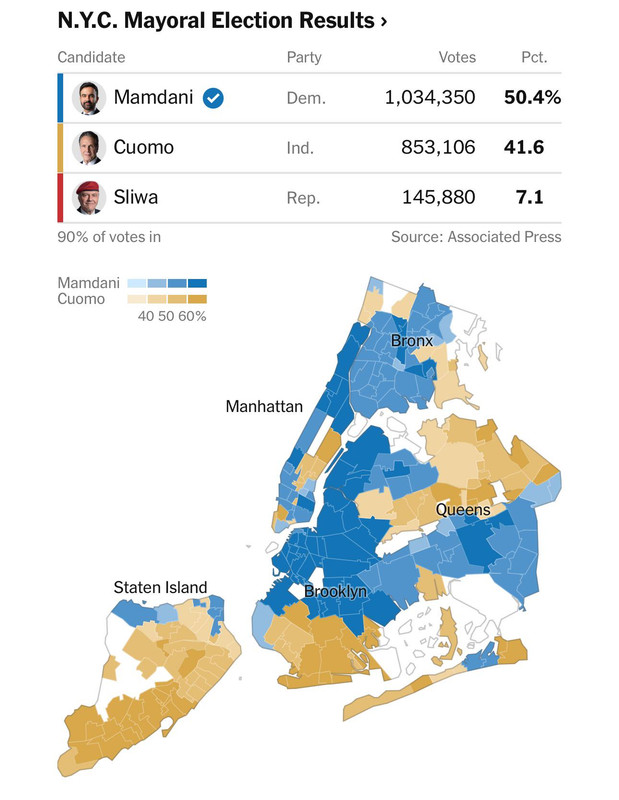 Man muss aber aufpassen – gerade wenn wir von unserer Seite des Atlantik darauf blicken – weil die New Yorker Wählerschaft so gar nicht dem amerikanischen Durchschnitt entspricht. Also nur weil Mamdani (wenn man andere Dems dazu addiert) voraussichtlich drüber fährt, heißt das nicht, dass bei den Midterms eine Blaue Welle ins Haus steht.