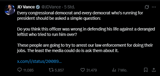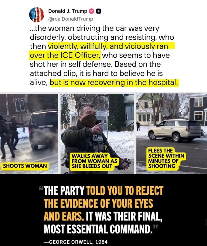 Denen ist nicht mehr zu helfen. WENN ein Auto auf mich zufahren würde, dann würde ich zur Seite springen, und nicht den Fahrer erschiessen und mich überfahren lassen. Die ICE Agents sind schon harte NPCs. Auf beiden Videos ist das aber gut zu sehen das sie nur noch vor den ”Agenten” fliehen will wo sie doch vorher dazu aufgefordert wurde weg zu fahren und dann einer zu ihrer Tür stürmt. Allein bei der Vance Pressekonferenz ist keiner aufgestanden und hat mit einem Schuh geworfen. Das Land ist einfach nur Lost.