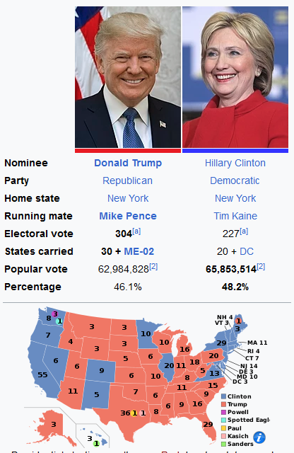 Ja, das weiß ich. Auf der Electoral Map war der Gewinn aber dann doch relativ groß gegen Hillary. Aber du hast recht, dass selbst seine bestes Wahlergebnis kein grandioses eigentlich ist.