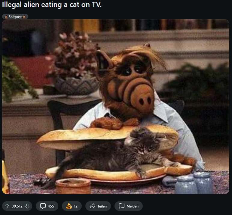 oder zu seiner aussage, dass die ganzen „illegal aliens“ die hunde und katzen essen. nachdem seine aussage widerlegt wurde, sagt er sinngemäß: „i saw it on television!“