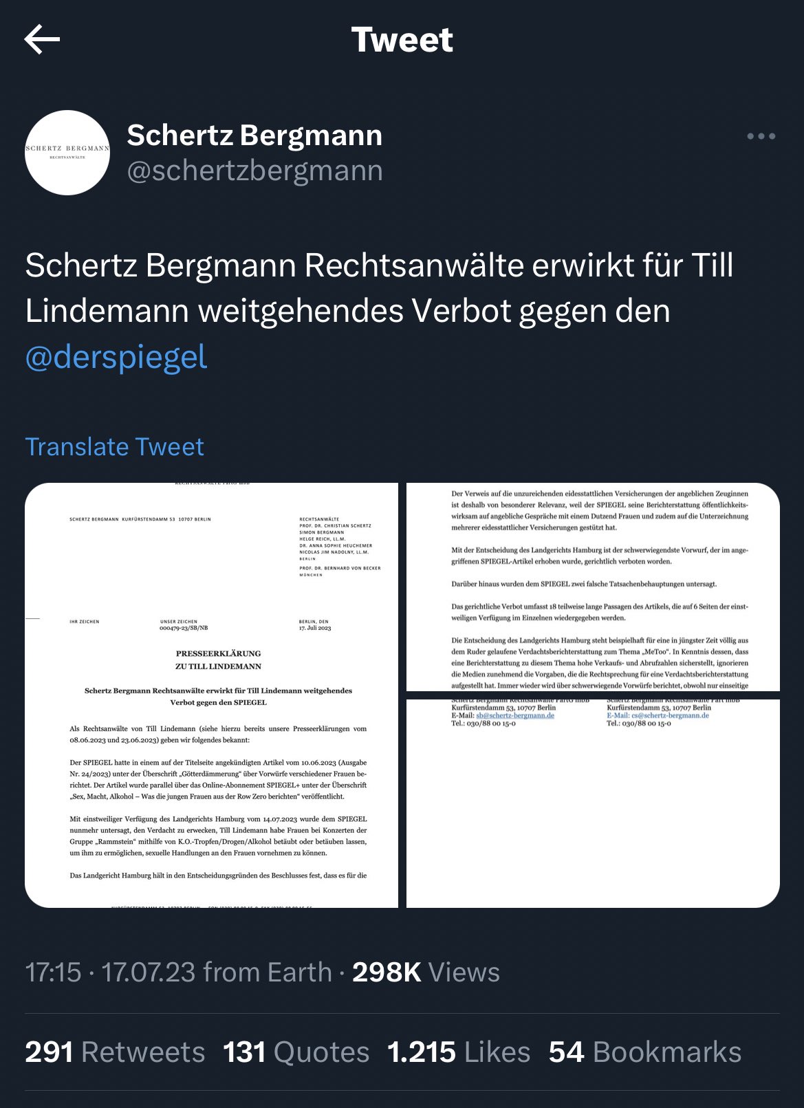 Guter Thread auch von der Spiegel-Redakteurin wo dargestellt wird, was nach dem Antrag von den Anwälten von Lindemann wirklich im Artikel geändert werden musste. Da sieht man schon, dass der wichtigste Teil immer noch drin bleibt und es nicht wirklich so ist wie die Kanzlei es dargestellt hat.