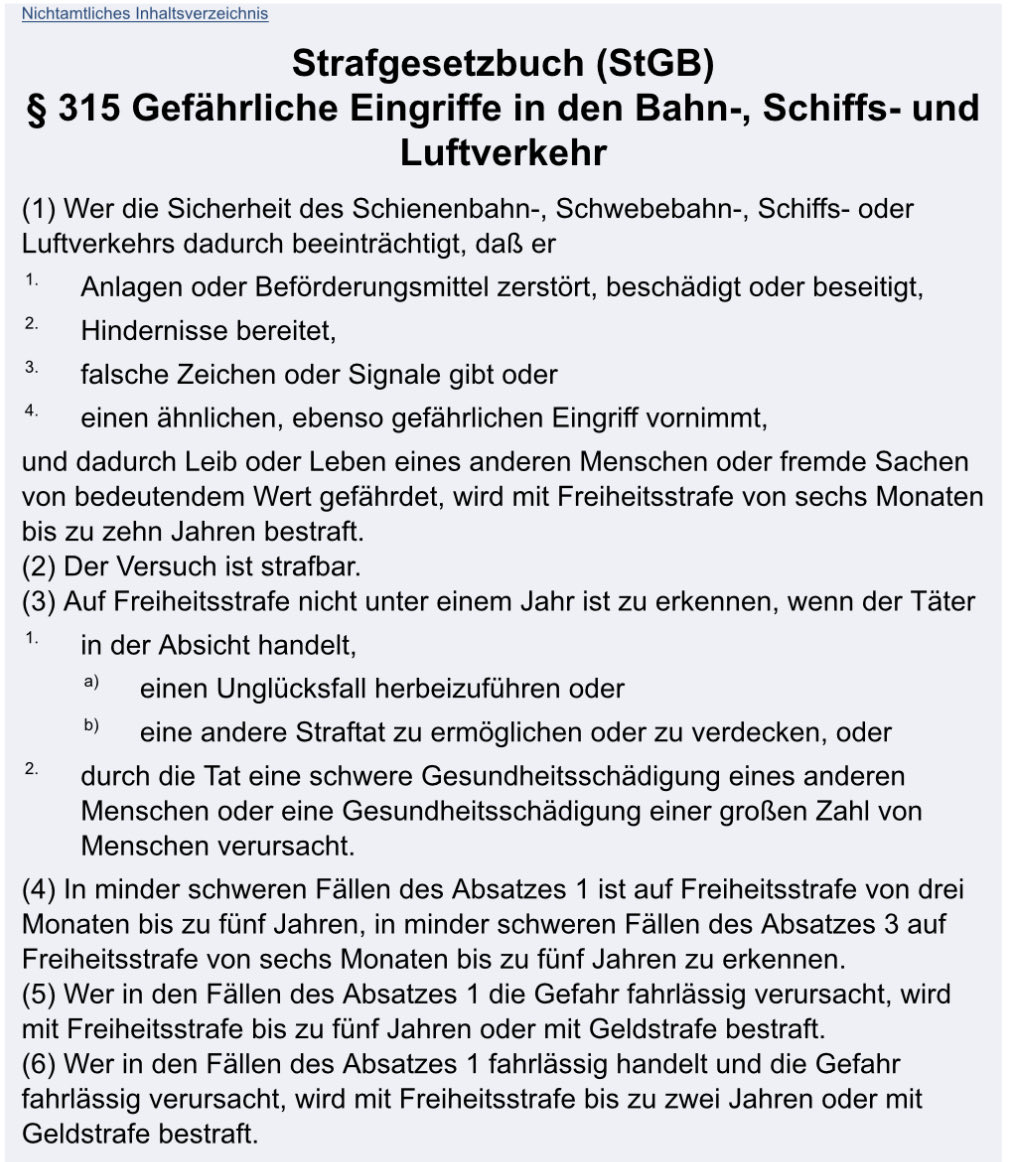 Vor allem da 315 StGB hier recht unproblematisch nicht einschlägig sein dürfte, aber kopiert sich halt schnell. Jedenfalls sehe ich keine Gefährdung von Leib und Leben oder Sachen von bedeutendem Wert.